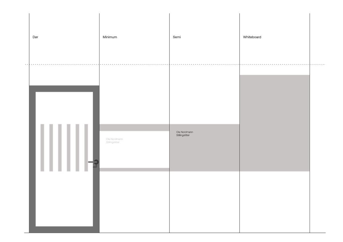 Skiltsystem til kontorer bør være fleksible og enkle å skifte ut ved behov. Et fint alternativ til dette er å benytte skiltkasser. Innhold på skiltet tilpasses etter hvor mange som tilhører de aktuelle rommene. Her brukes fonten Aeonik Light. Størrelse på navn er 48 pt, størrelse på stillingstittel er 29 pt og linjeavstand er 40 pt. Skiltet plasseres på samme side som dørvrider. Senterhøyde på skiltet bør være 150 cm over gulv og avstand fra vegg bør være minst 10 cm. Det er viktig at avstandene er konsekvente gjennom bygget.