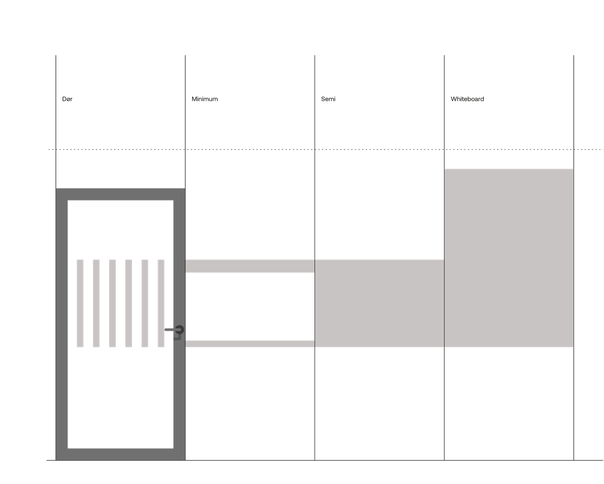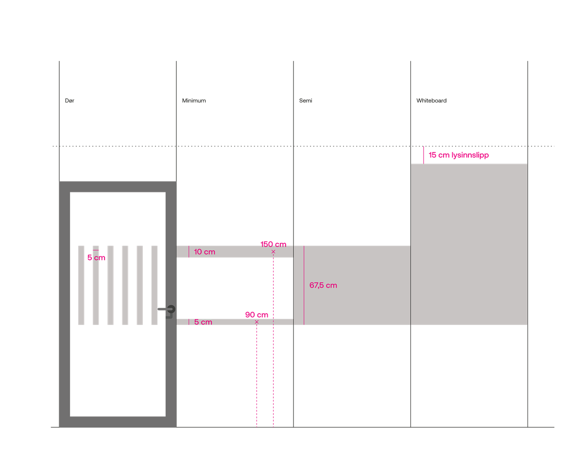 Vi deler inn skjerming av glassflater i fire kategorier; dør, minimum, semi og whiteboard. I tilfeller der hvor det er mye innsyn og dette ikke er ønsket, kan man bruke semi skjerming. Det skal i alle tilfeller foretrekkes å bruke frostdekor. Denne er ikke lystett og vil derfor gi en behagelig atmosfære. Det er også mulig å dekke større deler av glassflata for å kunne benytte glasset som whiteboardtavle. Dette er spesielt ideelt i tilfeller hvor det er minimalt med veggflater å benytte seg av. Det skal være tydelig forskjell på dør og vegg, og krav til universell utforming og grafisk profil må følges.